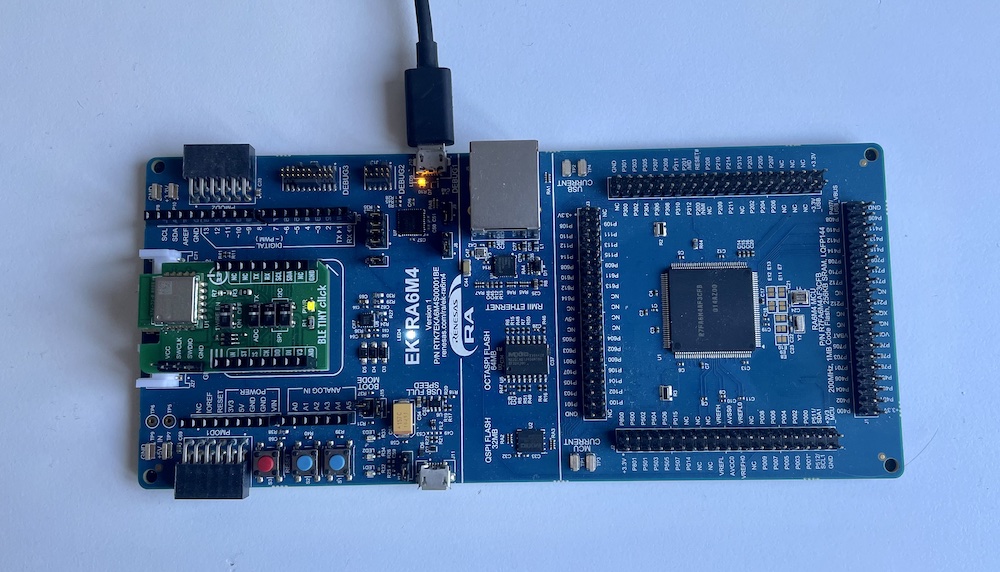 This port uses the Renesas EK-RA6M4 and a Renesas DA14531 Controller on the MikroeE BLE Tiny Click board