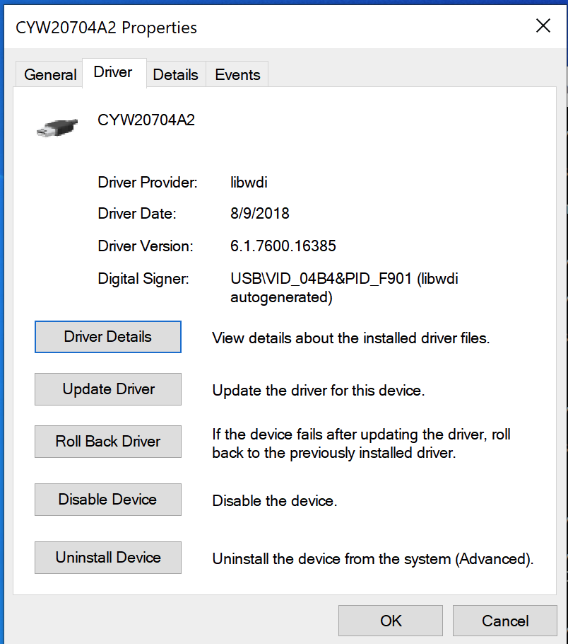 After the new driver was installed, your device is shown in the Device Manager with Device Provider 'libwdi'