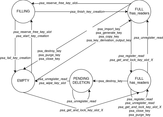 In the state transition diagram above, an arrow between two states q1 and q2 with label f indicates that if the state of a slot is q1 immediately before f's linearization point, it may be q2 immediately after f's linearization point. Internal functions have italicized labels. The PSA_SLOT_PENDING_DELETION -> PSA_SLOT_EMPTY transition can be done by any function which calls psa_unregister_read.